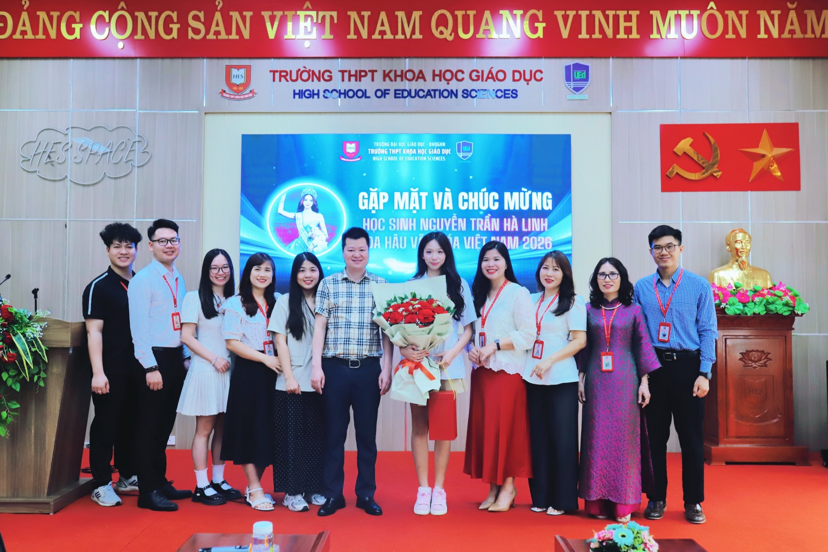 (HES) - Sáng ngày 07/04/2026, Ban Giám hiệu Trường THPT Khoa học Giáo dục cùng các thầy cô giáo đã tổ chức một buổi gặp gỡ vô cùng ấm áp nhằm vinh danh và chúc mừng em Nguyễn Trần Hà Linh, học sinh lớp 12D2 vừa xuất sắc đăng quang ngôi vị Hoa hậu Văn hóa Việt Nam năm 2026. Buổi gặp mặt là dịp để Nhà trường ghi nhận kịp thời những nỗ lực tuyệt vời của cô học trò nhỏ, đồng thời lan tỏa niềm tự hào chung của toàn thể đại gia đình HES.
