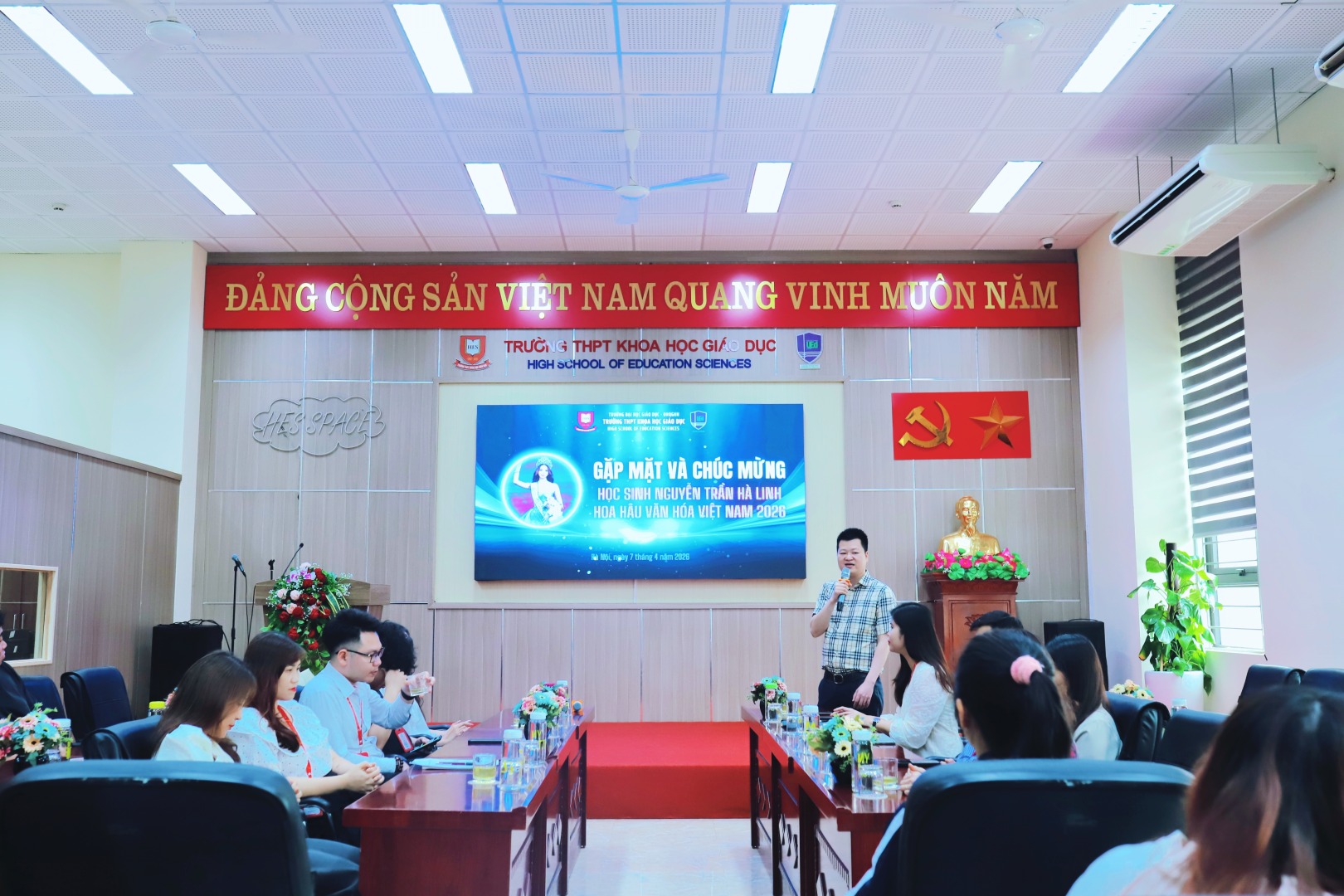 (HES) - Sáng ngày 07/04/2026, Ban Giám hiệu Trường THPT Khoa học Giáo dục cùng các thầy cô giáo đã tổ chức một buổi gặp gỡ vô cùng ấm áp nhằm vinh danh và chúc mừng em Nguyễn Trần Hà Linh, học sinh lớp 12D2 vừa xuất sắc đăng quang ngôi vị Hoa hậu Văn hóa Việt Nam năm 2026. Buổi gặp mặt là dịp để Nhà trường ghi nhận kịp thời những nỗ lực tuyệt vời của cô học trò nhỏ, đồng thời lan tỏa niềm tự hào chung của toàn thể đại gia đình HES.
