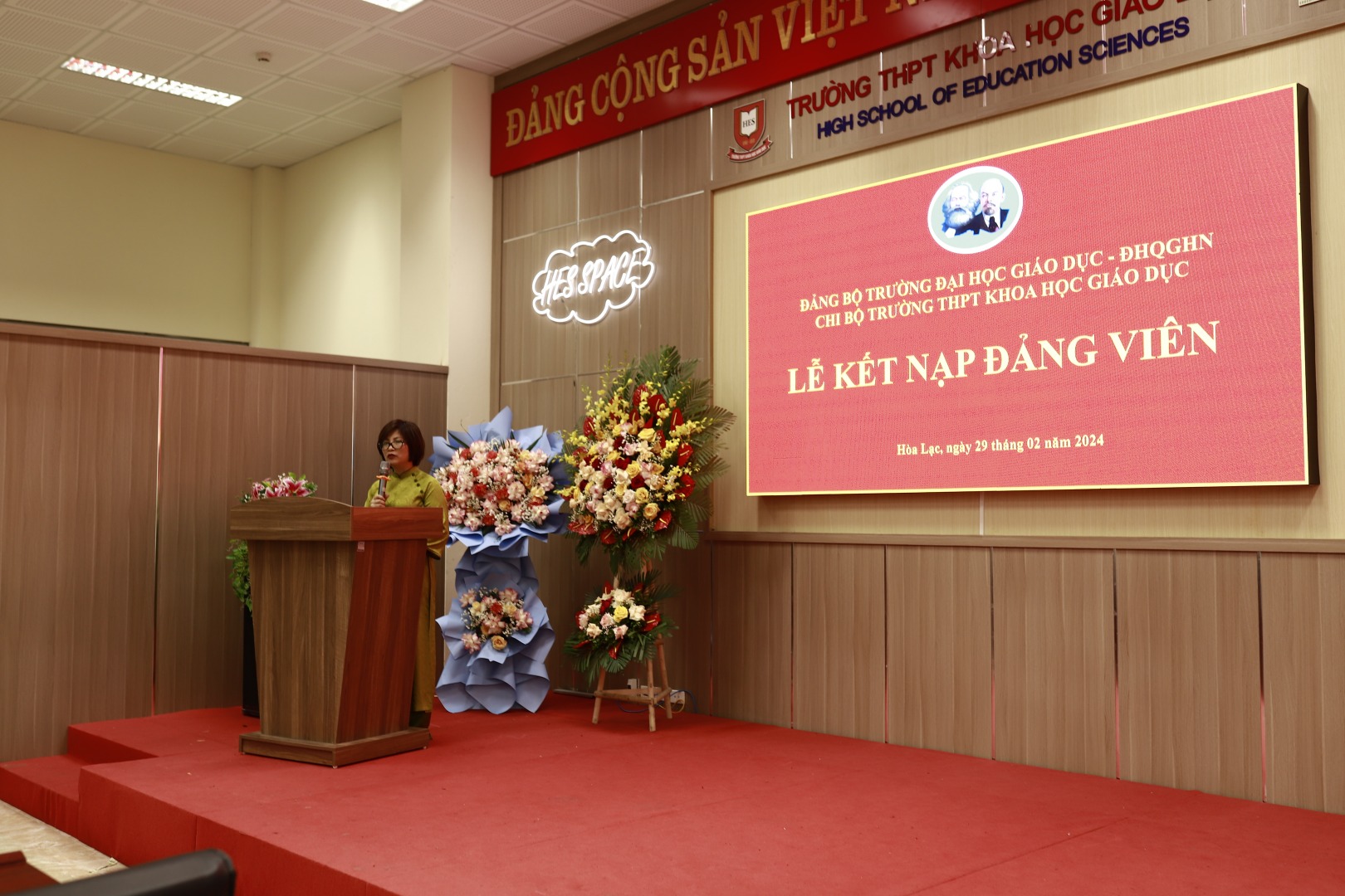 Trao Quyết định, chúc mừng, giao nhiệm vụ cho các đồng chí đảng viên mới, PSG. TS. Nguyễn Thị Hương, Bí thư Chi bộ, Chủ tịch Hội đồng trường THPT Khoa học Giáo dục bày tỏ hi vọng và tin tưởng rằng các đồng chí đảng viên mới sẽ không ngừng cố gắng phát huy vai trò của mình để xứng đáng đứng hàng ngũ của Đảng và đóng góp cho công tác Đảng, sự phát triển chung của Trường THPT Khoa học Giáo dục, Trường Đại học Giáo dục, ĐHQGHN.